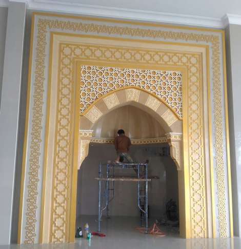 Kami memulai dengan pengukuran detail lalu menyusun shop drawing untuk setiap elemen—mihrab, kolom, kongliong, listplang, hingga kusen jendela. Produksi dilakukan di pabrik dengan kontrol mutu ketat sehingga ukuran presisi dan motif konsisten. Setelah itu, elemen diberi finishing duco putih dan metallic gold agar sesuai konsep Masjid Babussalam.